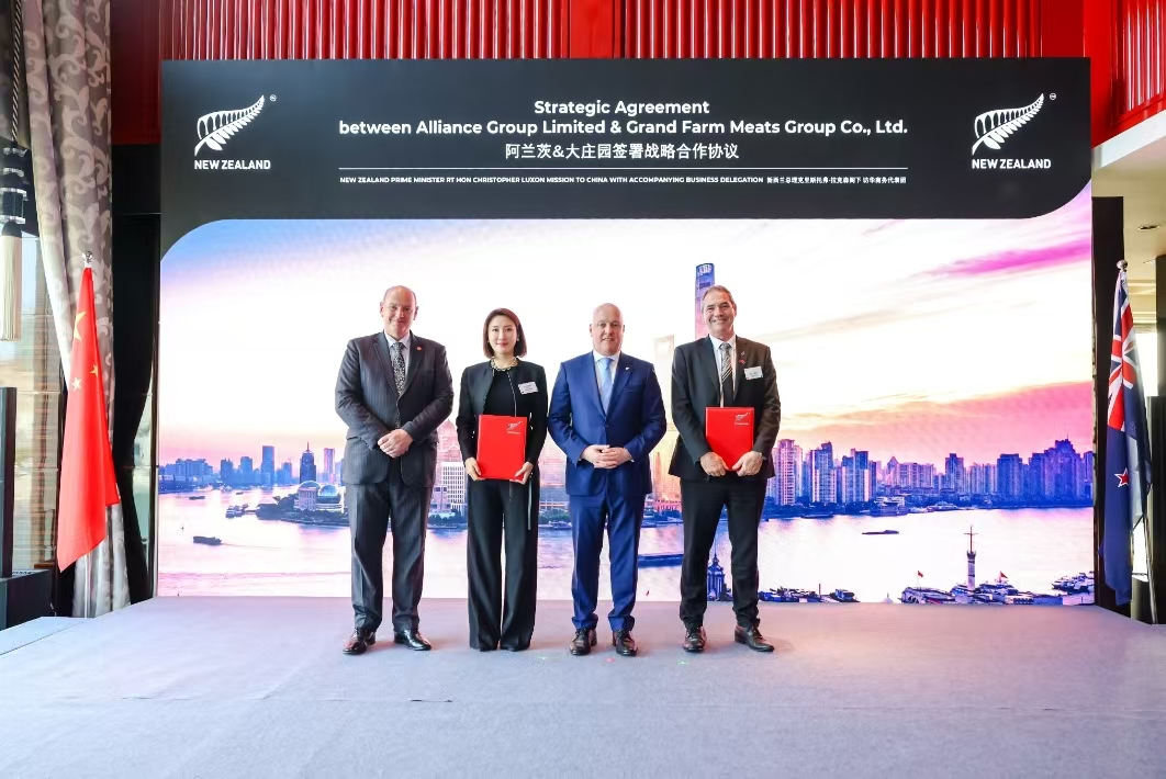 2025年6月,首次訪華的新西蘭總理克里斯托弗?拉克森在上海開展了一系列商務活動。大莊園集團作為行業龍頭企業,憑借其30年在國際貿易中做出的貢獻,在拉克森總理的見證下與新西蘭阿蘭茨集團簽訂了戰略升級協議,并得到新西蘭肉協官方授牌。