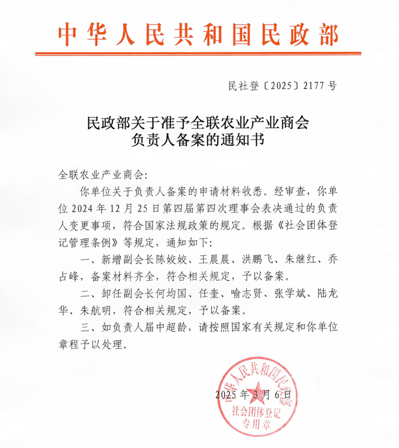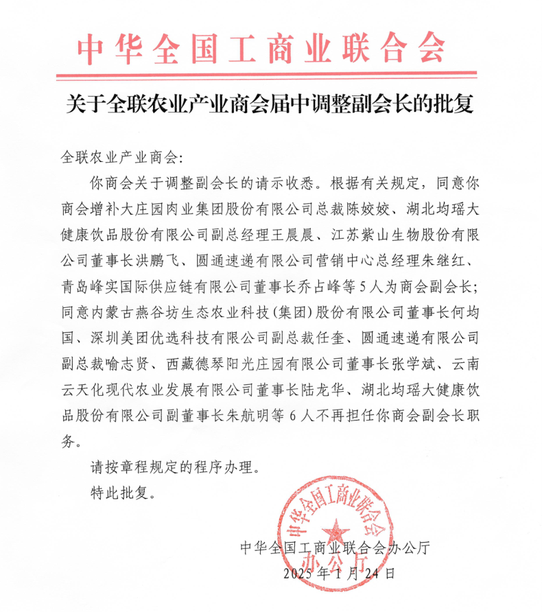 在大會正式召開之前,全國工商聯農業產業商會還召開了第四屆第四次理事會、第七次常務理事會暨第九次會長辦公會。會議匯報了2024年商會工作情況及2025年工作計劃,并審議通過了新增及調整副會長人員名單,分支機構成立的申請和論壇活動管理制度等事項,并傳達全國工商聯沈瑩書記一行調研商會時的講話要點。大莊園集團總裁陳姣姣當選全國工商聯農業產業商會副會長。